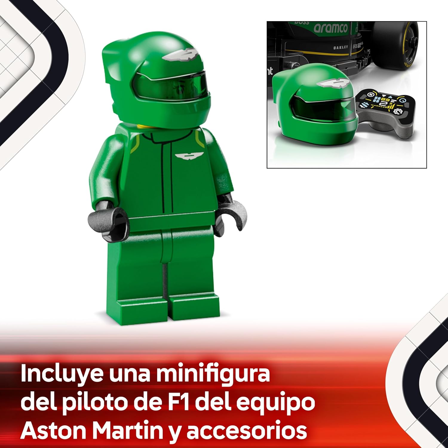 - Incluye 1 minifigura de piloto con traje Aston Martin y casco con alas.